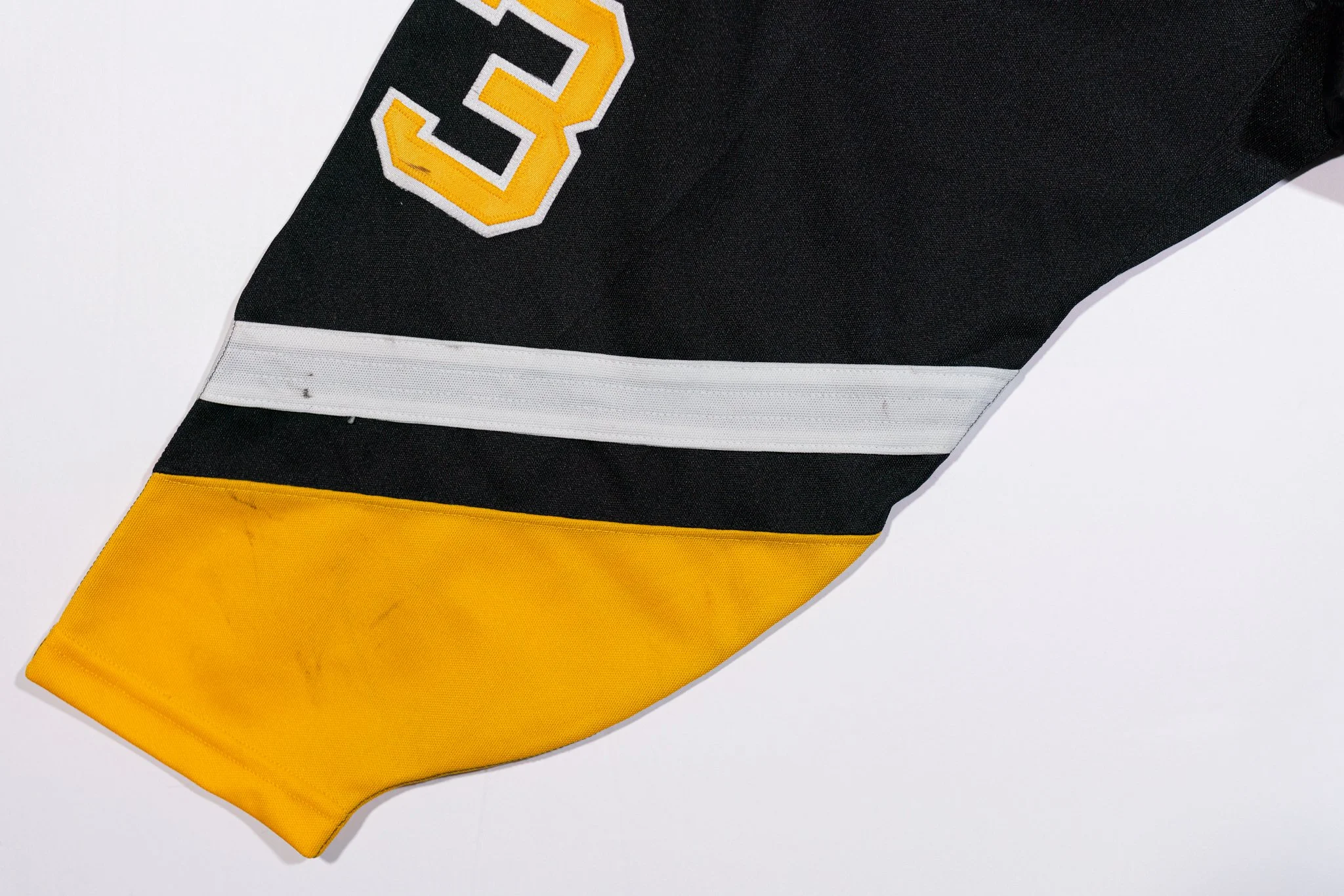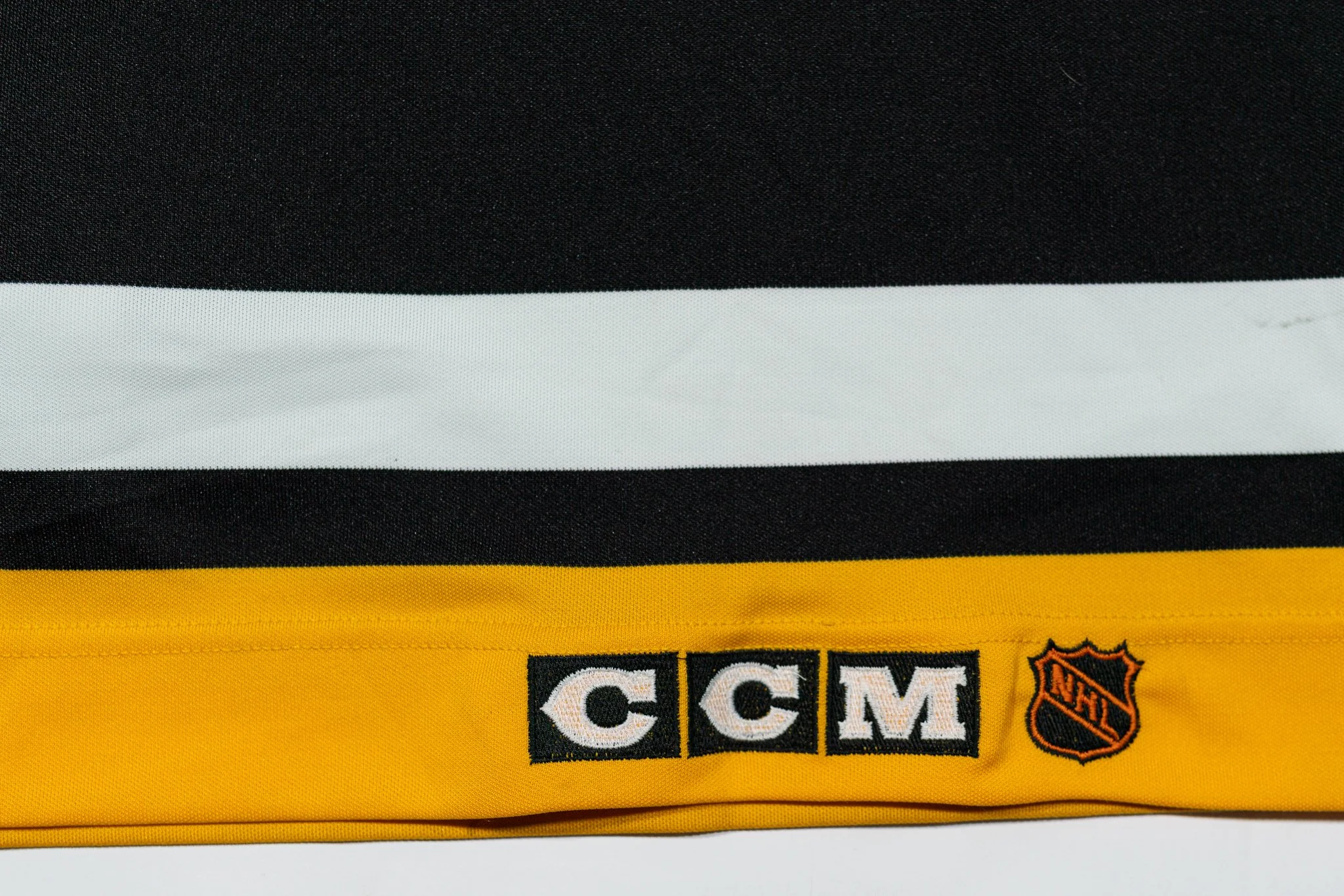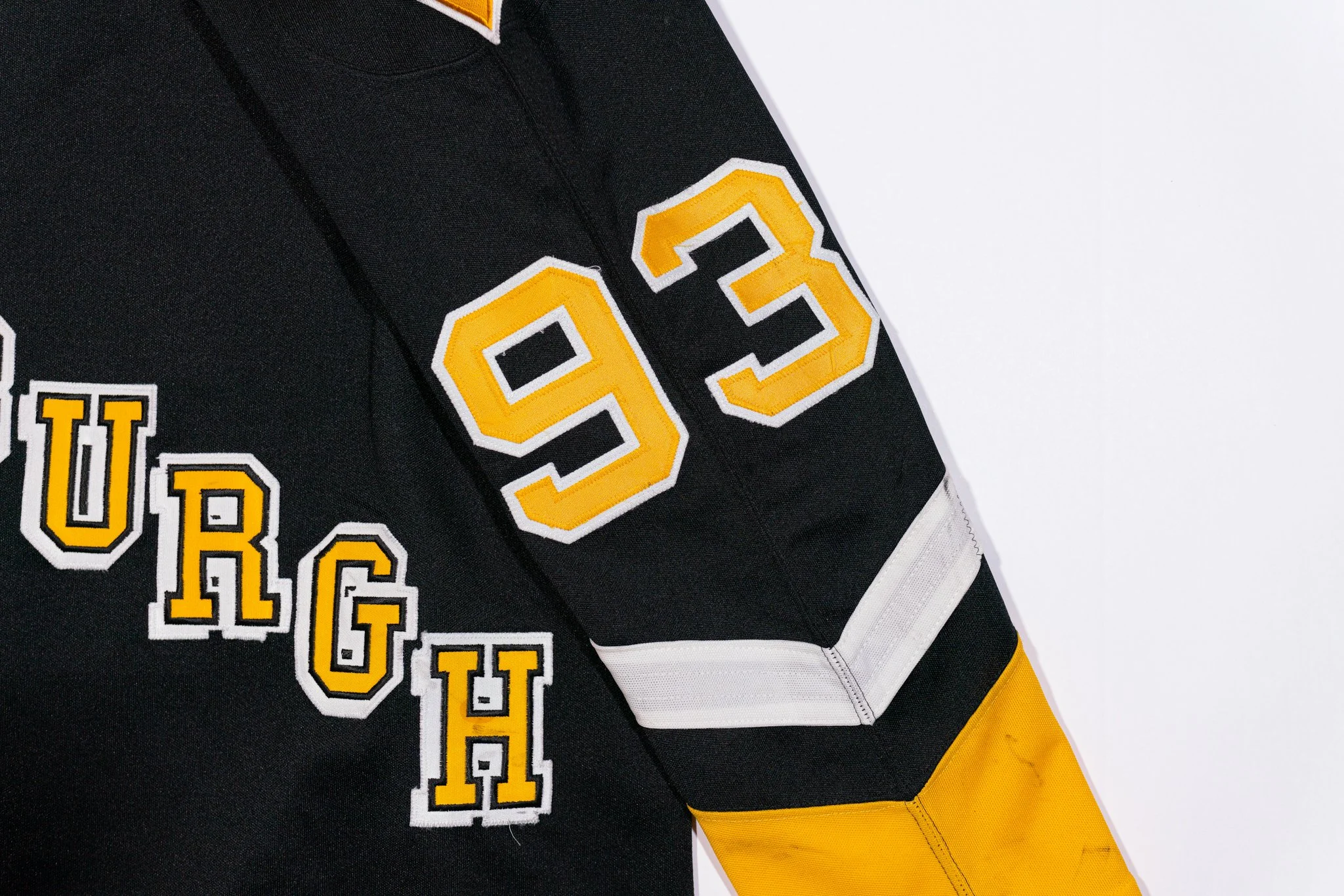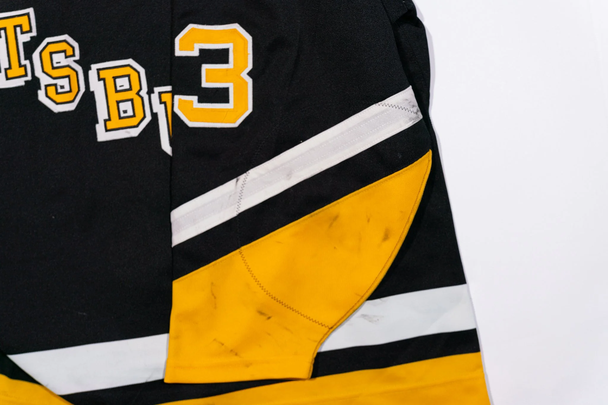 This jersey features moderate wear with plenty of stick and puck marks, board burns, and interior pilling. Photo-matched to a couple of cards and video-matched to his 44th goal of the season on April 14th ‘96, assisted by Lemieux and Jagr. Video match courtesy of Casey Samuelson of penguinschronicles.com
