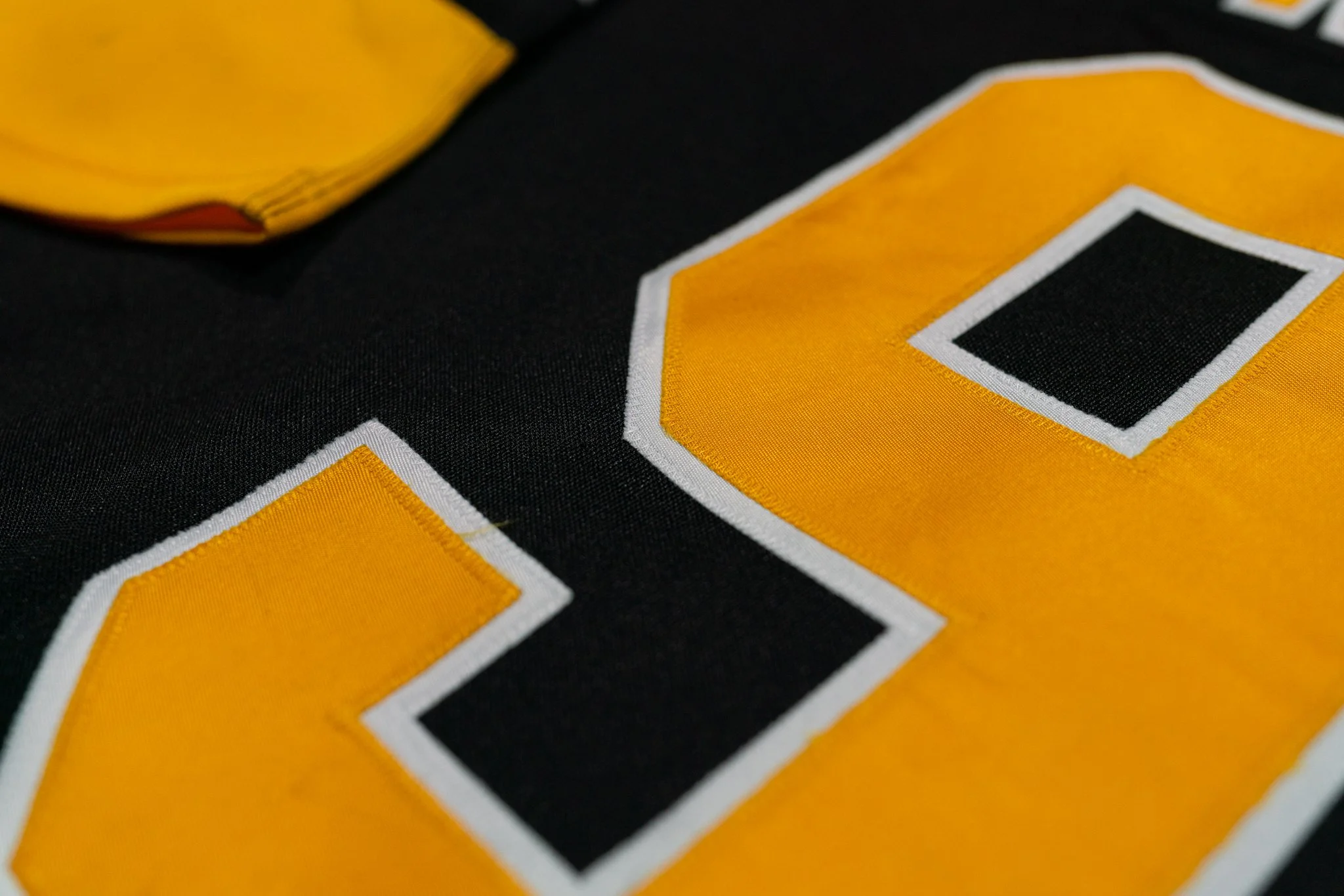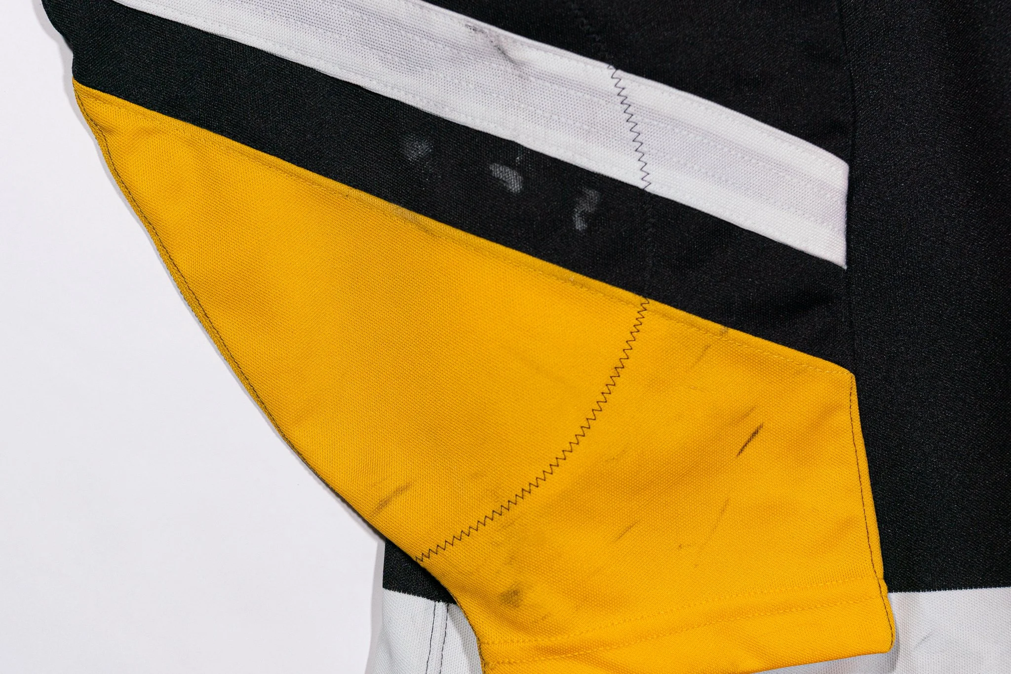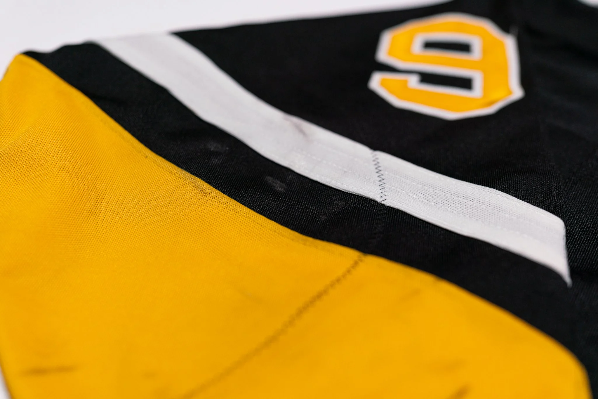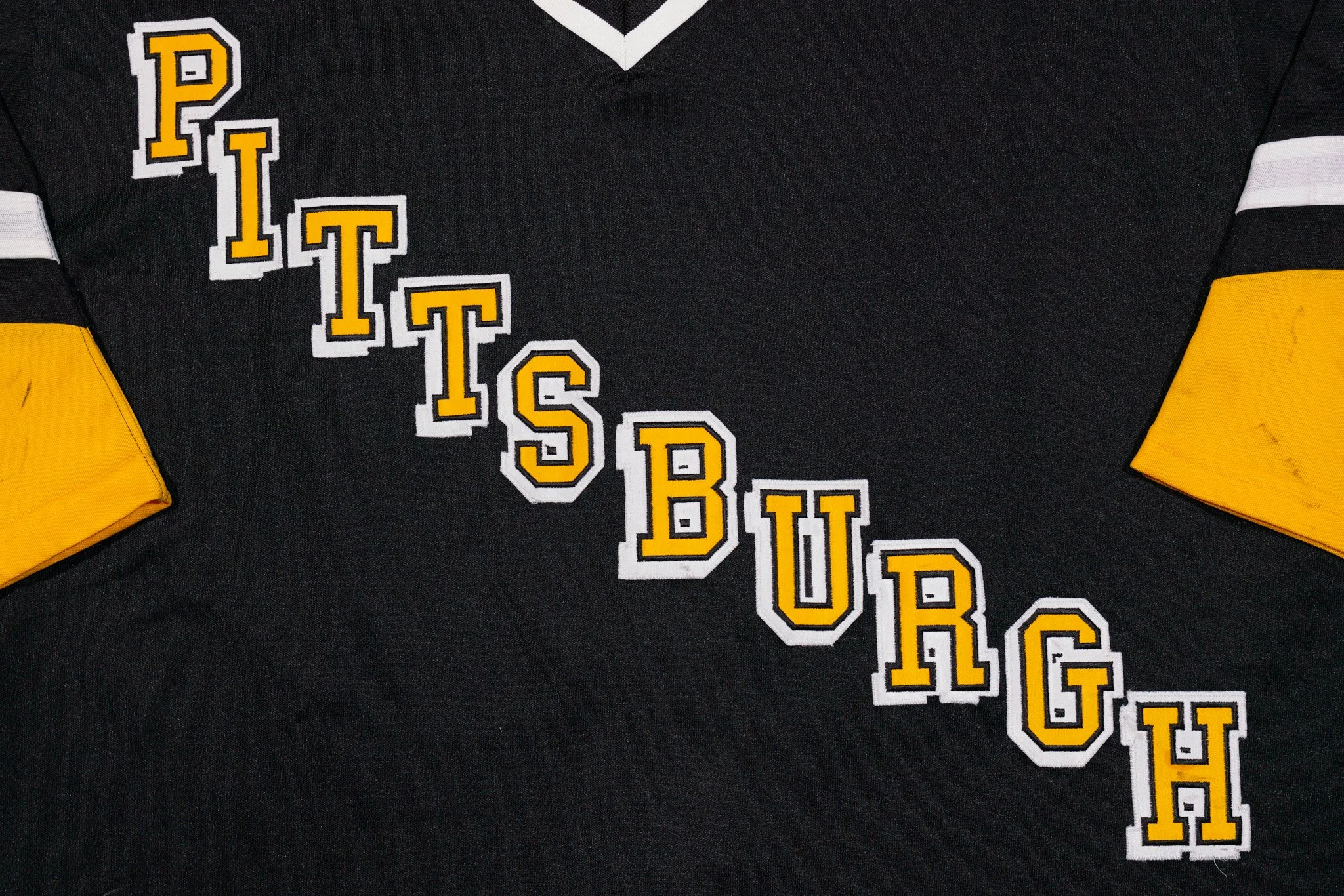 This jersey features moderate wear with plenty of stick and puck marks, board burns, and interior pilling. Photo-matched to a couple of cards and video-matched to his 44th goal of the season on April 14th ‘96, assisted by Lemieux and Jagr. Video match courtesy of Casey Samuelson of penguinschronicles.com