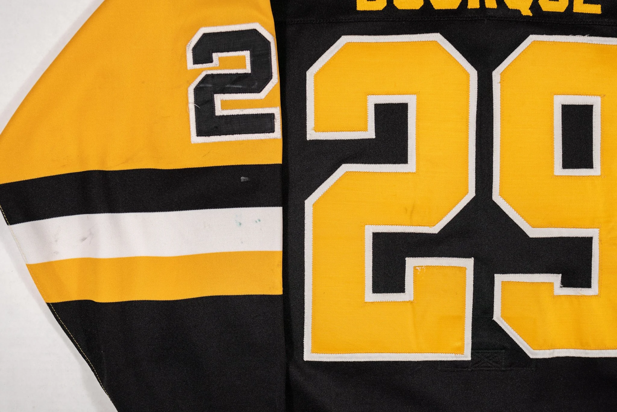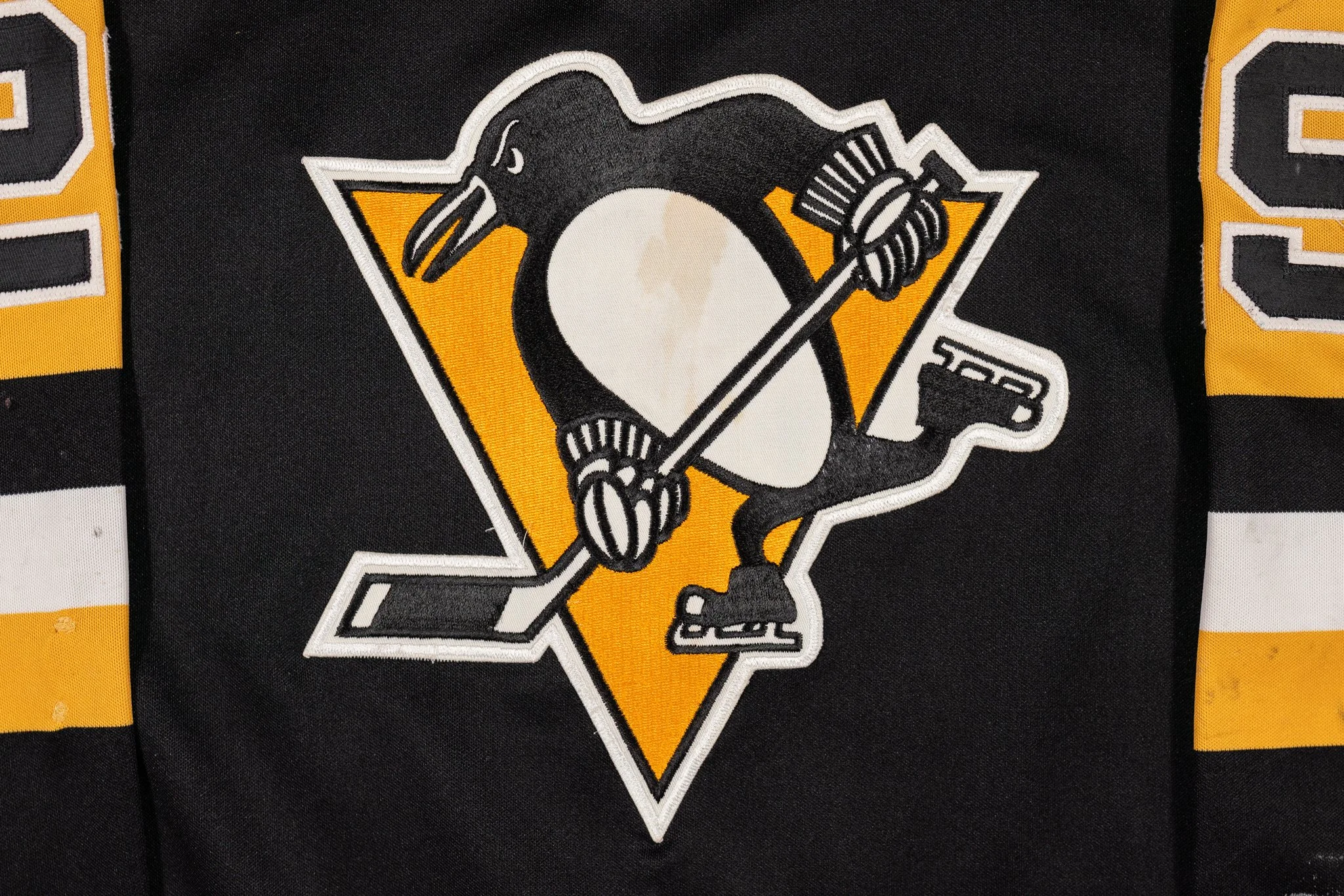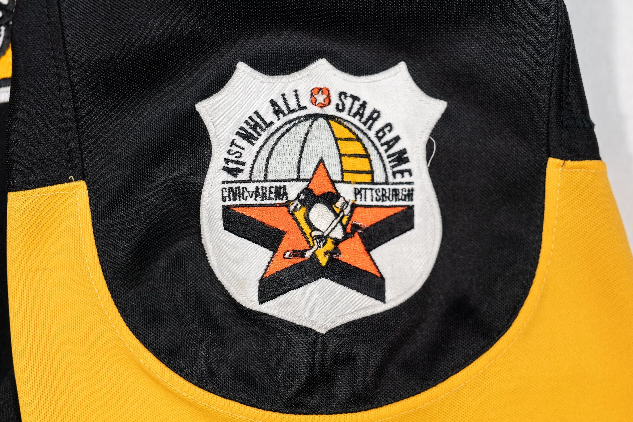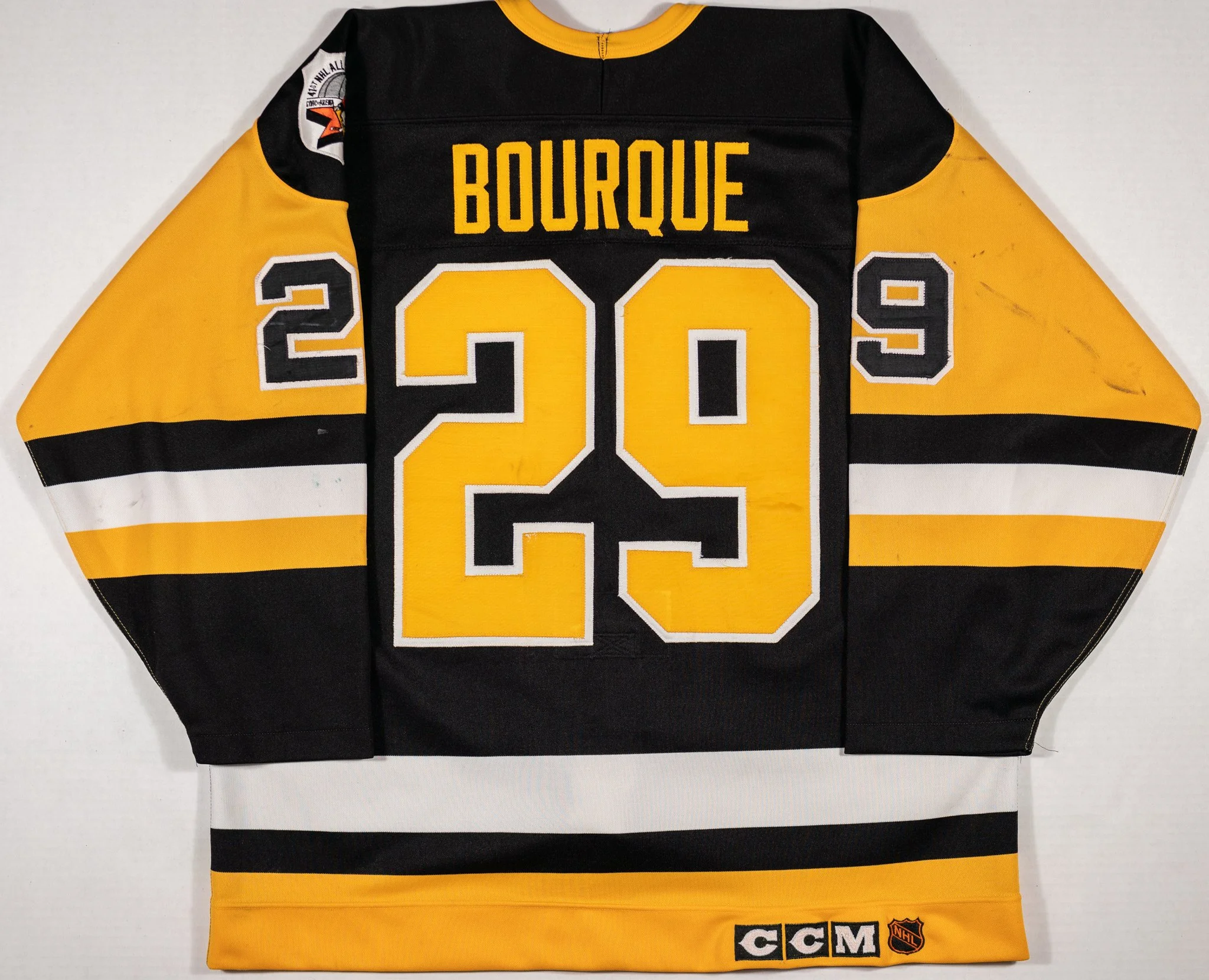 Worn at the tail end of the 1989-90 season, the ollllll’ 29’er scored a handful of points (and PIMS/fights) in this beauty, and even bowled over Patrick Roy for a disallowed goal. Lots of great wear and repairs, and possibly a blood stain. The 1989-90 NHL All Star Game patch, held in Pittsburgh, is sewn to the left shoulder. The jersey is photomatched to a March 2nd, 1990 game against the Devils.